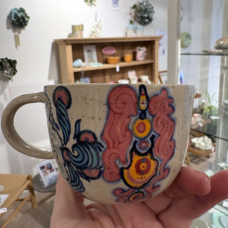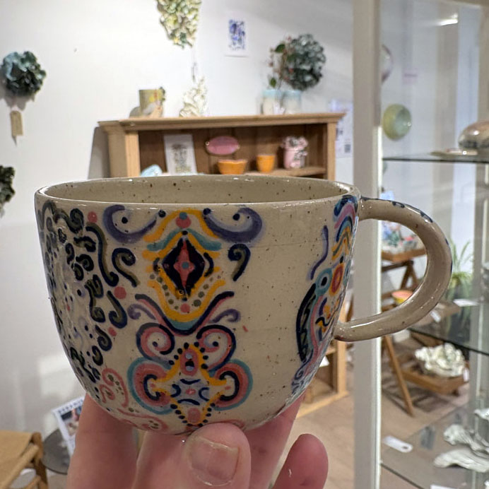 LINs karakteristiske streg og intuitive farveunivers møder det keramiske håndværk i et krus, der både fungerer som brugsting og lille kunstværk.