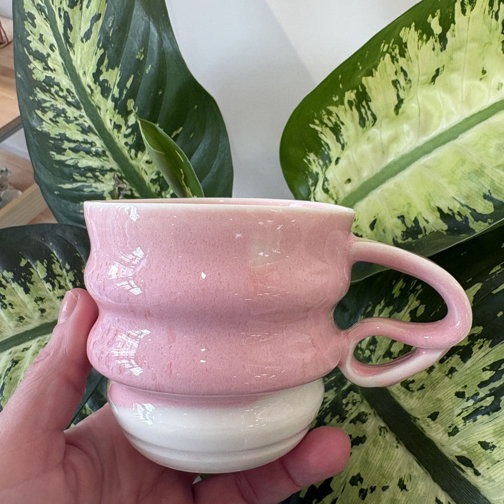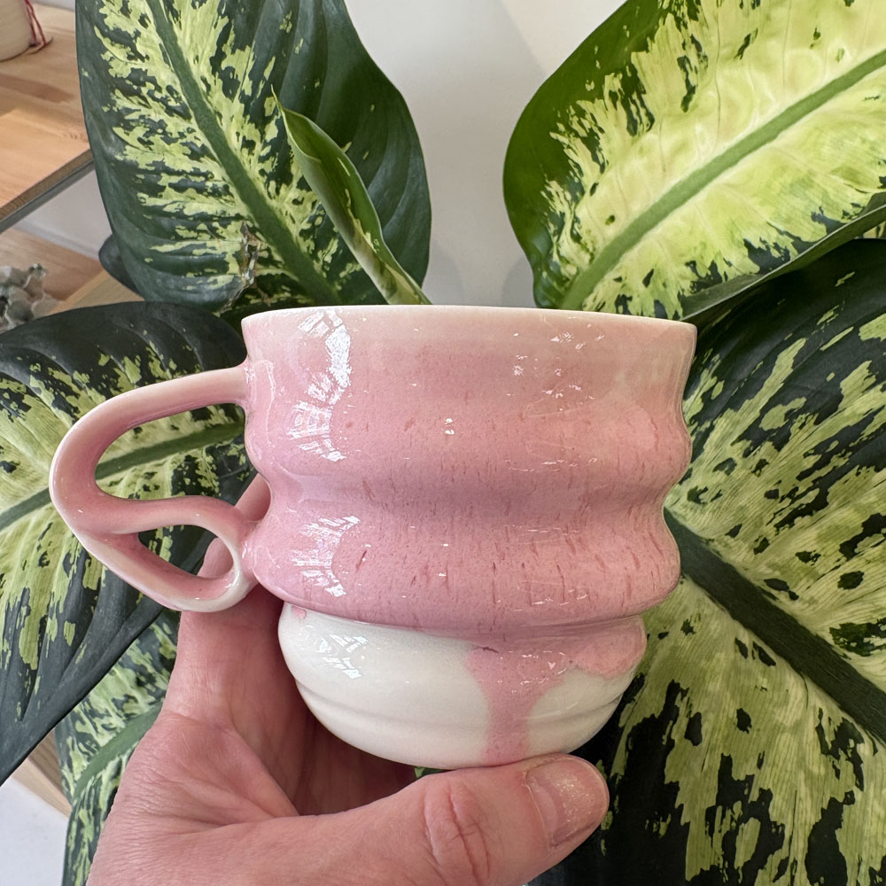 Håndlavet kop i porcelæn – Unik glasur i rosa og i porcelænets eget hvide ler med hank