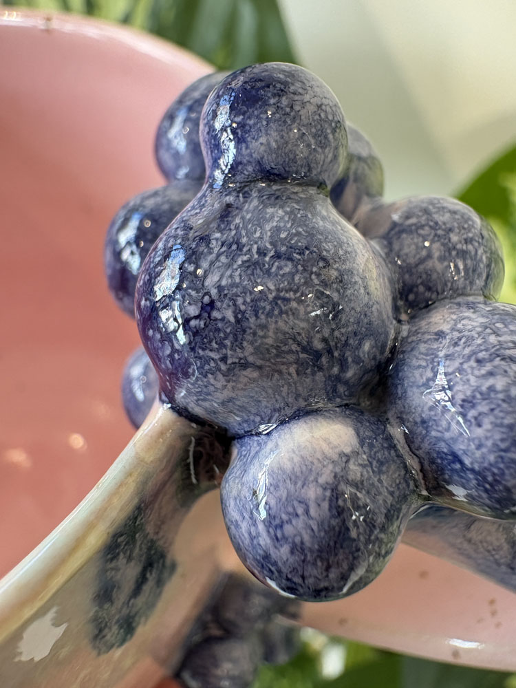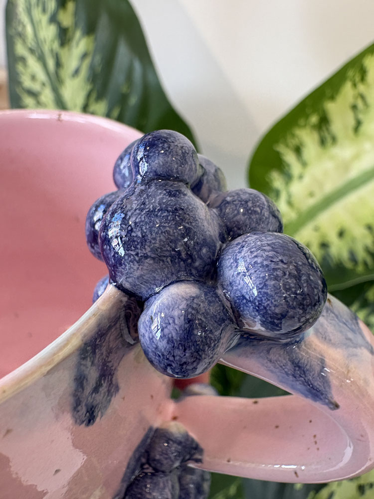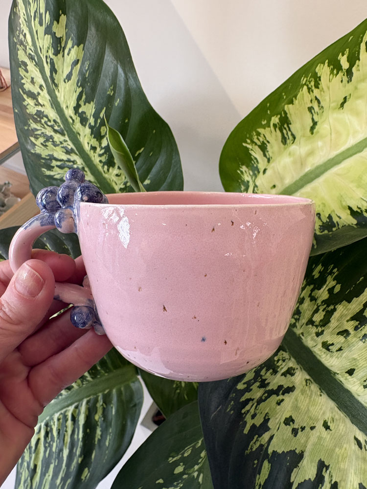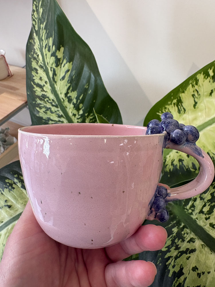 Håndlavet kop med lyserøde og pastelglasurer og hank med kugler/druer | PiaV Keramik