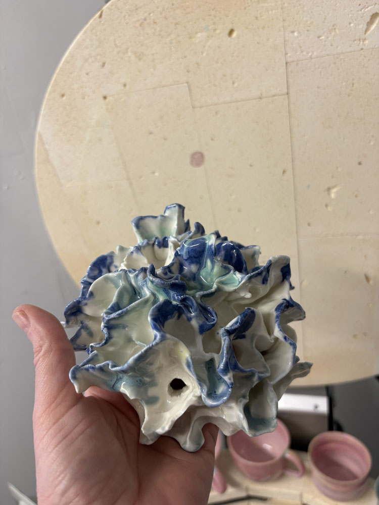 **Porcelæn indeholder meget fine partikler og har en høj krympning under tørring og brænding. Det betyder, at leret arbejder mere end andre lertyper, og der kan opstå små spændinger i materialet – især på bagsiden eller i tykkere områder. Disse spændinger kan vise sig som fine revner, som ikke har betydning for hverken funktion eller holdbarhed.