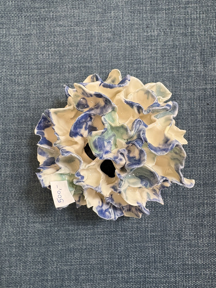 Dette keramik til væggen er håndformet i porcelænler og opbygget i en organisk, bølgende struktur, der skaber dybde og bevægelse på væggen. Porcelænets egen hvide farve står i rolig kontrast til de blålige nuancer fra glasurerne, som samler sig i folder og kanter.