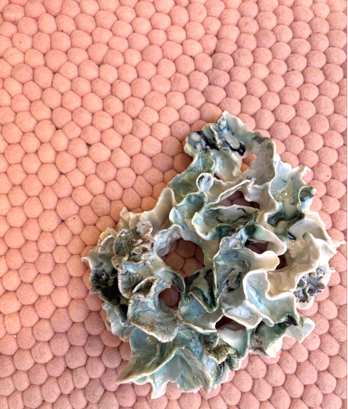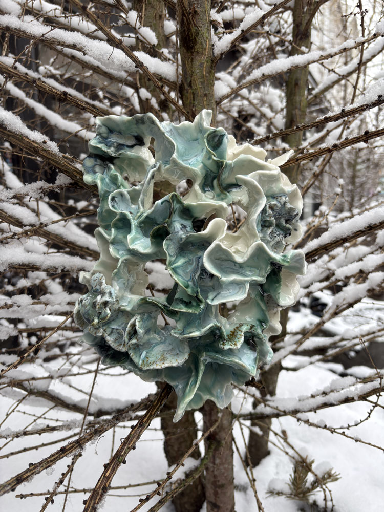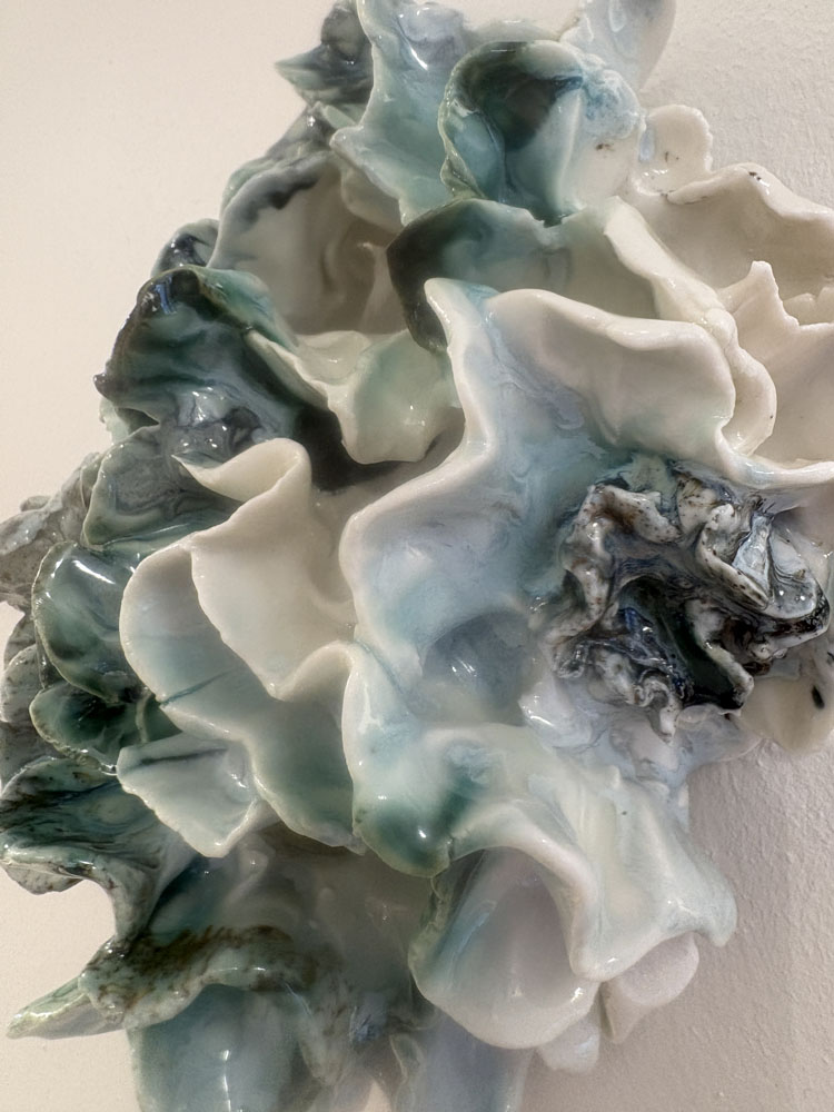 Dette keramik til væggen er håndformet i porcelænler og opbygget i en organisk, bølgende struktur, der skaber dybde og bevægelse på væggen. Porcelænets egen hvide farve står i rolig kontrast til de grønlige nuancer fra oxyderne, som samler sig i folder og kanter.