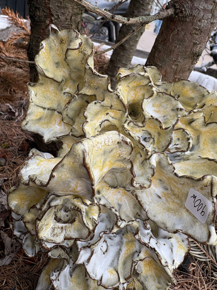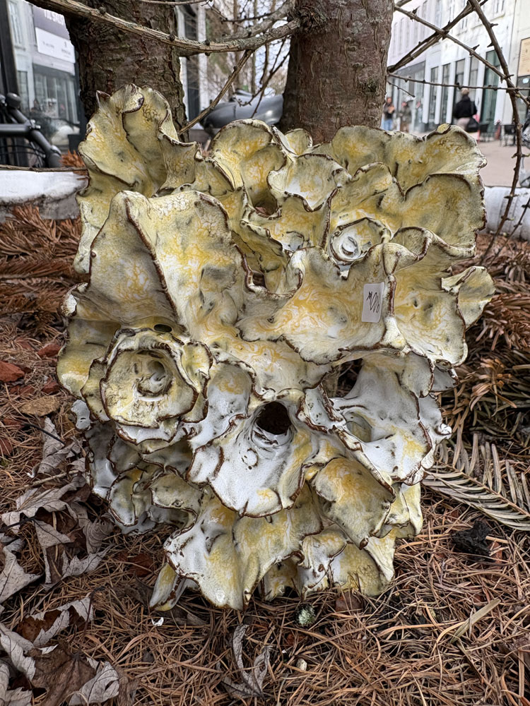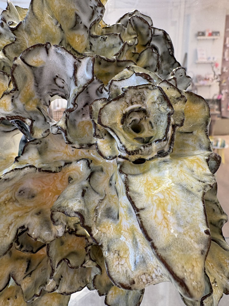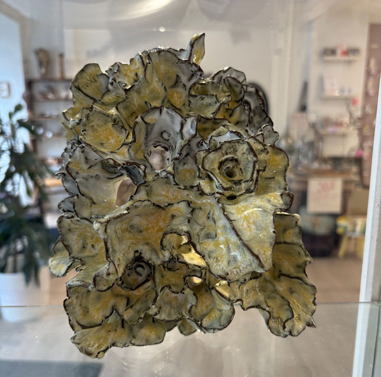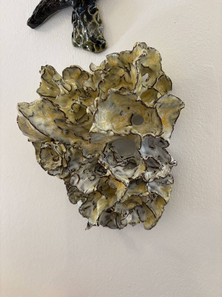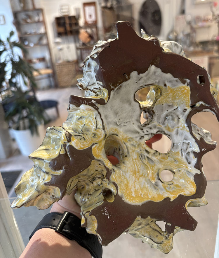 Keramik til væggen i rød stentøj med smukke lyse og gule nuancer – organisk vægophæng