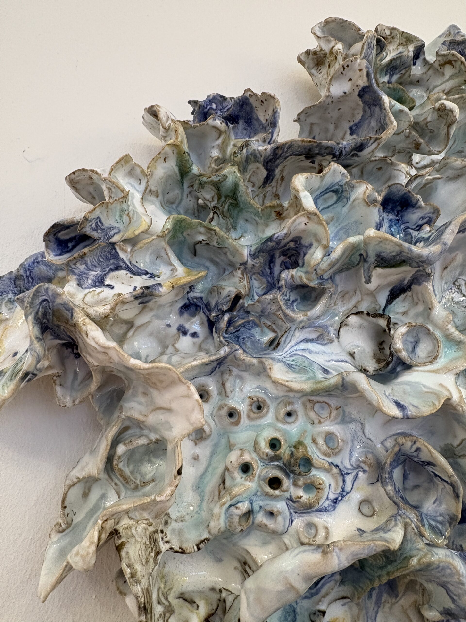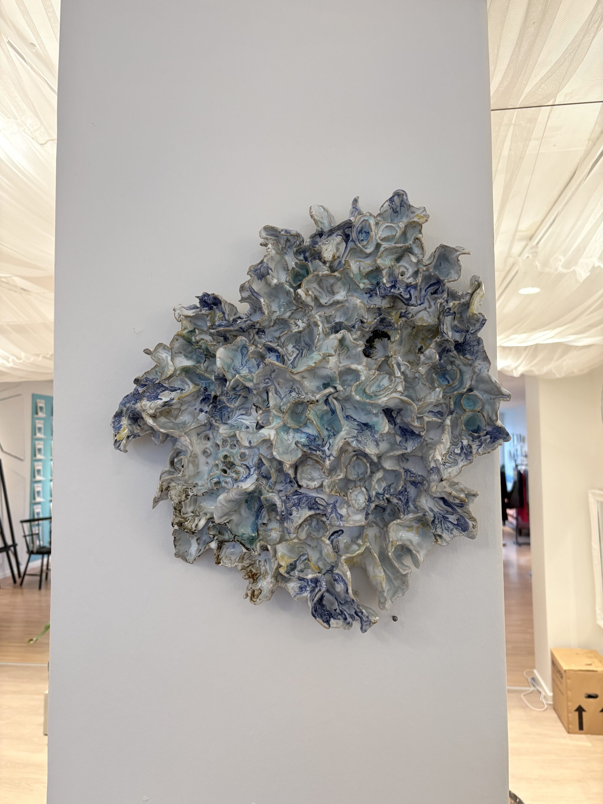 Vægophænget er skabt i lyst stentøj og dekoreret i smukke blålige og hvide nuancer.